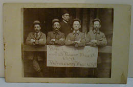 Shows a group of workmen and others standing on the porch of a brick building. Several hold mason trowels, saw, pick and other tools. Back of photograph stamped "Morton-Day 7, Sea View, Eastbourne." Also has browned ink "Mrs. Hollobon wishes to be remembered to you." |