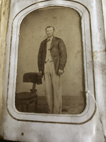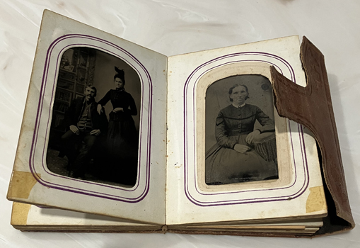 Leather wrap around cover with embossing and "Album" on in gold. Approximately 4-1/2" x 3-1/2" x 1" deep overall. Has 12 tin types (one of which is a gem), 1 carte de visite and 2 others. Shows images of 6 women. 2 men, 1 group of two men, 1 couple, 4 children and 1 infant. | SALE $125.00 | |