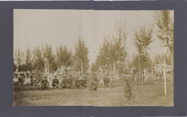 Shows a company of soldiers with their rifles, lined up and kneeling in front of their tents. Approx. 10" x 12" overall, image has tear in it in the sky in center of image, but glued flat. | SALE $10.00 | |