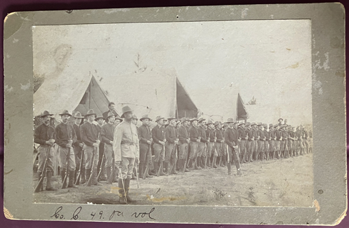 Labeled under Picture "Co. C 49. Ia, Vol." Shows the company lined up in the field with rifles, in front of tents. Labeled on back "Frank Pilher (?) Co. C 49. Ia. (?)" Approximately 5" x8" overall. Some marks to image (See image link). | SALE $35.00 |