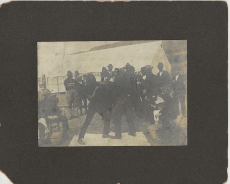 Taken in an Army Camp with tents in the background. Approximately 8" x 10" overall, the cardboard backing is missing the lower left hand corner and chipping to edges of the board (see image.) There is also damage to the image to the right of the two soldiers boxing (above the hand of the soldier seated to the right holding towel in his lap. Several boys in the onlookers. | SALE $15.00 |