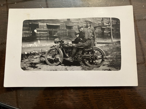 Shows a soldier in fron of a three wheeled motorcycle with covered rear cab. He is in front of barn door. Has a stamp on back "0 82". Approximately 3-3/10" x 5-1/2" overall, nothing else on the back. | SALE $6.00 |