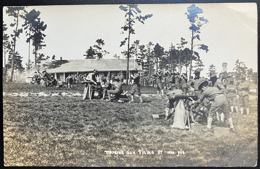 Labeled "Machine Gun firing at 1000 yds." Taken by A.C. Heidrick Photographer Monterey, Cal. Shows four machine guns, one firing, three being readied. Soldiers wiaitng around in background. Approximately 3-1/2" x 5-1/2" overall, divided back, unused. | SALE $8.00 |