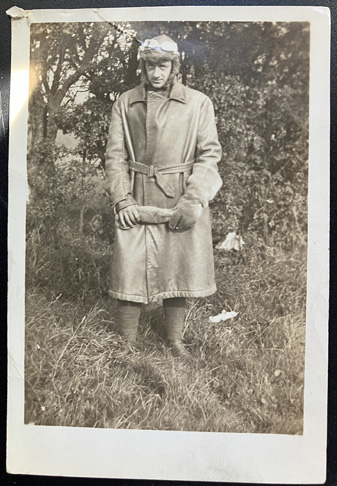 Shows a pilot in leather coat and fur lined helmetand goggles, with one glove on, one that he is holding. Approximately 3-1/2" x 5-1/4" overall, divided back, with "Aviator WWI" written in pencil. | SALE $20.00 |