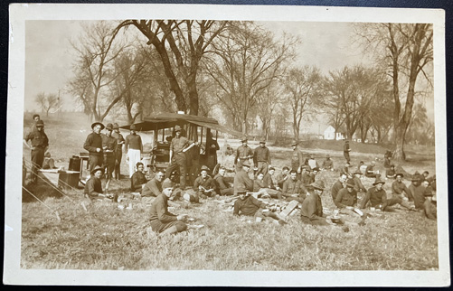 Labeled on back "Balloon Company #4" in ink, it shows a company of men in the field around a wagon, eating. 3-1/2" x 5-1/2" overall, undivided back. | SALE $12.00 |