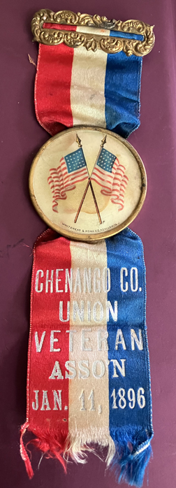 Red, white and blue ribbon with celluloid crossed flag medallion in center. Printed in silver "Chenango Co. Union Veteran Asso'n Jan. 11, 1896" | SALE $16.00 |