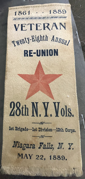 White silk, printed with blue and red. "1861-1889 Veteran Twenty-eighth Annual Re-union 28th N.Y. Vols. 1st Brigade-1st Division-12th Corps Niagra Falls, N.Y. May 22, 1889". Has red star in the center of ribbon. | SALE $30.00 |