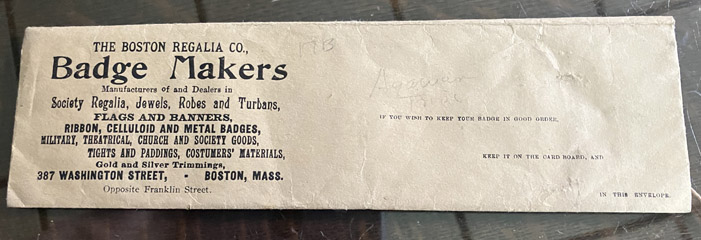 "The Boston Regalia Co., Badge Makers Manufacturers of and Dealers in Society Regalia, Jewels, Robes and Turbans, Flags and Banners, Ribbon, Celluloid and Metal Badges, Military, Theatrical, Church and Society Goods, Tights and Paddings, Costumers' Materials, Gold and Silver Trimmings, 387 Washington street, Boston, Mass. Opposite Franklin Street." "If you wish to keep your badge in good order, keep it on the card board and in this envelope." | Envelope Only SALE $24.00 |