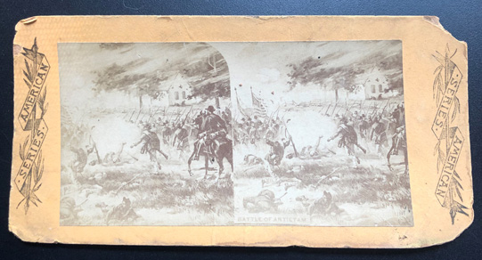 Series American, labeled "Battle of Antietam".Stereo of a painting depicting the battle. It shows Union troops storming the Confederate lines. Corners are rough (see image.) Approx. 3-1/2" x 7" overall. |