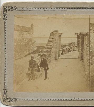 Label on the back "Drawbridge of the Old Spansih Fort, showing Mantanzas River with Anastasia Island in the Distance." Shows a Native American Scout guarding the drawbridge of Fort Marion (where Cheyenne and other Native American prisoners of the Red River were imprisoned.) He wears the five button blouse and kepi hat, holding a rifle. Approximately 4" x 7". Slight rip to image paper of one side of images.