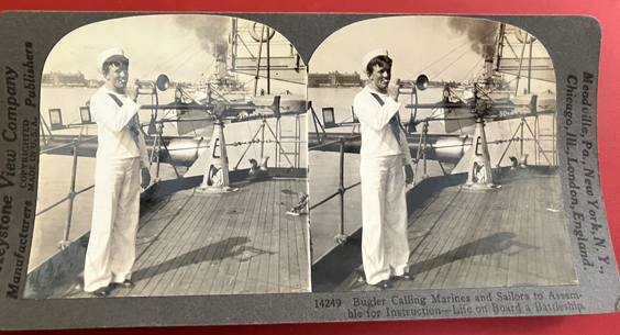 Titled "14249 Bugler Callling Marines and Sailors to Assemble for Instruction- Life Aboard a Battleship". Keystone View Company Publisher, Manufacturers, Copyright. With description on back. Grey mount. Additional battleship in background.