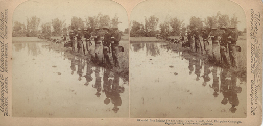 "Skirmish Line halting for rest before wading a paddy-field, Phillipine Campaign. Copyright 1899 by Underwood & Underwood." "Works and Studios Arlington, N.J. Littleton, N.H. Washington D.C. | S$10.00 | |