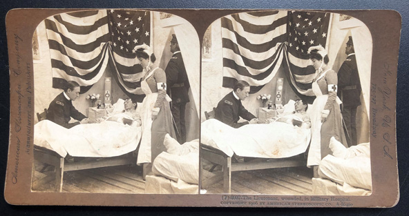American Stereoscopic Company Manufacturers and Publishers, New York U.S.A. 725-727 Broadway. "(7)-9007. The Lieutenant, wounded, in Military Hospital." Copyrighted 1906. Shows wounded patient on wooden field bed, doctor at bedside and nurse with red cross armband. There is another soldier with sword through the parted curtains on the right. the wrapped foot of another patient is just visible in the lower right hand corner. There is a large American Flad in the background. Approx. 3-1/2" x7" overall. | S$20.00 | |
