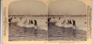 Titled "A Dash Through the Waters- Cavalry Horses Camp Tampa, U.S.A." Copyrighted 1898. Shows this famous cavalry camp along the beach in Florida, with troopers galloping through the water. | S $18.00 | |