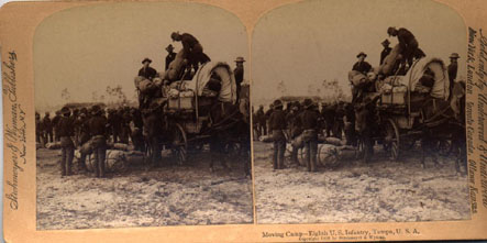 Sold by Underwood & Underwood. Copyrighted by Strohmeyer and Wyman 1898. Titled "Moving Camp- Eighth U.S. Infantry, Tampa, U.S.A." Shows wagon being loaded with soldier's packs and gear. Tan mount. |