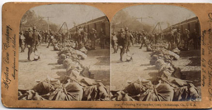 Copyrighted 1898 by B.L. Singley. No. 9122, titled "Unloading War Supplies, Camp Chickamauga, Ga., U.S.A." Shows packs in foreground, soldier in background in front of barracks. Tan mount. |