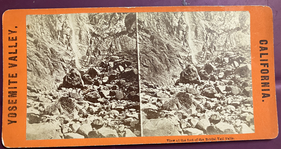 Titled "View of the foot of the Bridal Veil Falls." "Yosemite Valley. California." Ornage mount. |