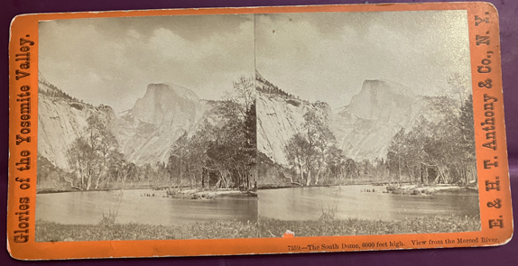Titled " 7359- The South Dome, 6000 feet high. View from the Merced River." "Glories of the Yosemite Valley." "E.&H.T. Anthony & Co., N.Y." Orange mount, with description on back of the South Dome.Has greeen sticker on back of "W.B. Schrader, Hoboken, N.J." |