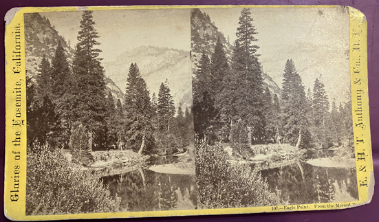 Titled " 107.- Eagle Point. From the Merced River." "Glories of the Yosemite, California." "E. & H.T. Anthony & Co., N.Y." Yellow mount. Some damages to corners. |