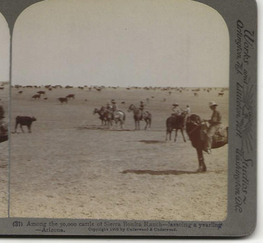 Underwood & Underwood stereo labeled "(31) Among the 30,000 cattle of Sierra Bonita Ranch- lassing a yearling.-Arizona." Copyright 1908 by Underwood & Underwood. Photo on grey mount card. Shows cowboys and a herd of cattle with a lassoed yearling. With printed narrative on back. |