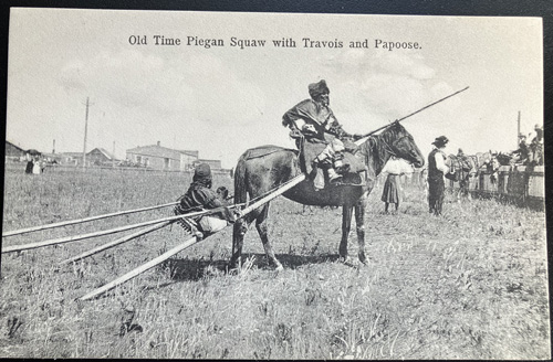 Labeled "Old Time Piegan Squaw with Travois and Pappose." Divided back, unused. "Copyrighted 1907 by A.Y. & Co." "Printed in Germany." 3-1/2" x 5-1/2" overall. |