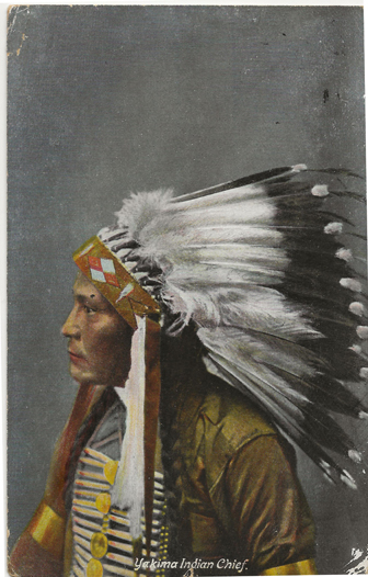 Labeled "Yakima Indian Chief", "M. Rieder, Publ., Los Angelos, Cal. No. 5105, Made in Germany. Approximately 3-1/2" x 5-1/2" overall, linen, used, divided back wtih one cent stamp on back and 1910 postmark date. |