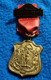 Massachusetts Seal drop with "Dept. of Mass. Grand Army of the Republic Adopted 1892" around Grand Army of the Republic Veterans Seal on the back. Hung from red silk ribbon from "GAR Massachusetts" bar. | SALE $ 35.00 |