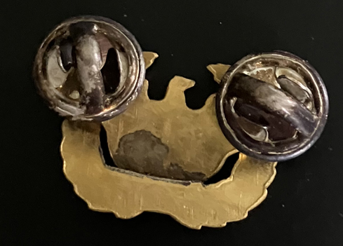 Circa WWII, it is agold metal "eagle rising" design (American eagle, with outstretched wings, holding arrows and surrounded by a laurel wreath. Has double clutch pins on back. Approximately 1-1/10" x 4/5" overall. | SALE $40.00 each |