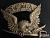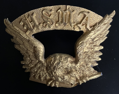 Brass spread winged eagle with lowered head, clutching a sword. Ribbon with "U.S.M.A." above wings. Has not affixing wires on back (missing) but can seee where they were. Approximately 2-1/2" x 2" overall. | SALE $125.00 | |