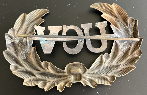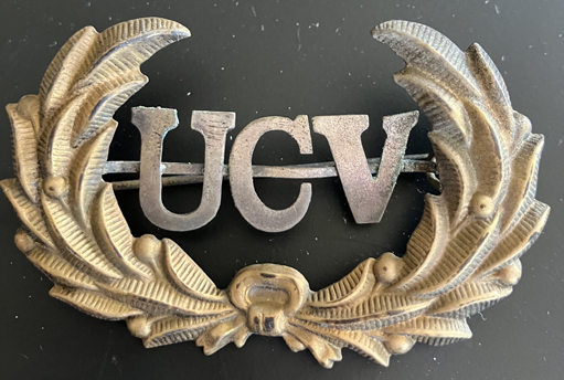 Flat letters "UCV" surrounded by a wreath. "C" clasp pin on back. One side of the bar with letters has detached. Approximately 2.75" x 1.75" overall. If need better pictures, email me. | SALE $175.00 | |