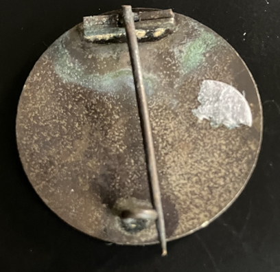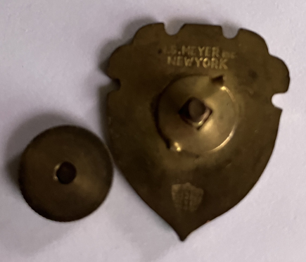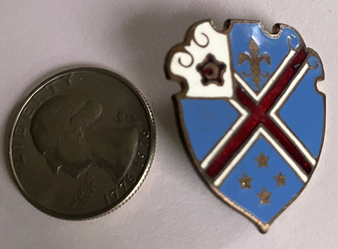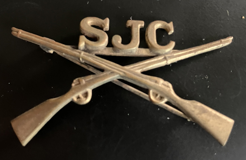 Crossed rifles (Infantry) with "SJC" above. St. John's had a military program in the early 20th century (JROTC). C clasp pin on back. Approximately 2" x 1" overall. | SALE $ 13.00 | |