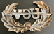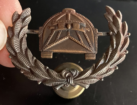 Armored tank (Mark IV) centered in a open-topped laurel wreath. Screwpost back and nut. Two needleponts. Approximately 1-9/10" x1-1/" overall. | SALE $45.00 | |
