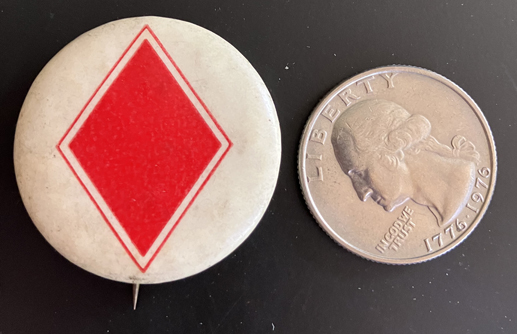 GAR Pin Button | White celluloid button with 24th Army Corps (Dept. of Virignia)badge in red. Has Whitehead & Hoag label inside back of button. Approximately 1-3/10" in diameter. | SALE $15.00 each |