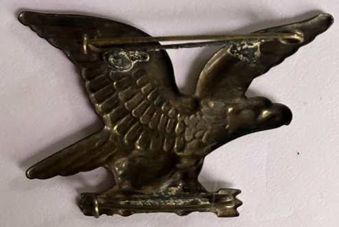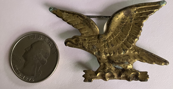 Brass left facing eagle, wings outspread, clutching arrowns in his talons. Converted into a double pin on back. | SALE $25.00 | |