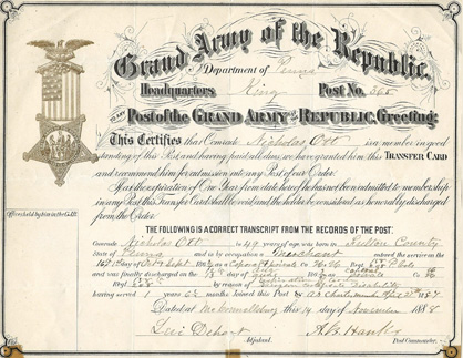 "This certifies that Comrade Nicholas Ott is a member in good standing of this post...recommed him for admission into any Post of our Order....Comrade Nicholas Ott is 49 years of age, was born in Fulton County, State of Penna and is by occupation a merhant...entered service in the ....1862/64....Corporal & Private....Regt. 158/208 P. Vols.....discharged...expiration of term/surgeon certificate disability...joined this post as charter member April 27th, 1887" | SALE $ 20.00 | |