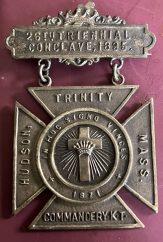 "26th Triennial Conclave 1895. Hudson, MA. Trinity Commandery KT" badge and pin bar. Stamped badge. makers' name on pin bar back "Eugene K. Richards, Boston." Also marking on pin bar "1053". | SALE $30.00 | |