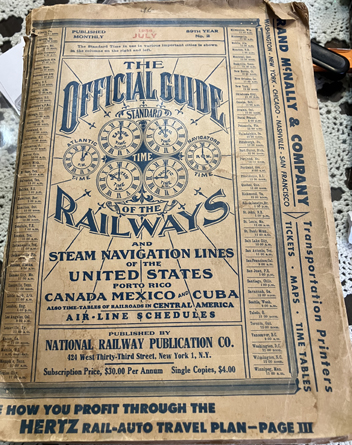 "Official Guide of the Railways and Steam Navigation Lines of the United States, Porto Rico, Canada, Mexico & Cuba... also Time-tables of Railroads in Central America... Aie-line Schedules. Shows its wear from use and age. Soft cover. Published by the National Railway Publication Co., monthly. Has abel on inside cover as to who was to go to, from one to the next. |
