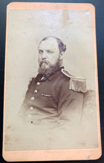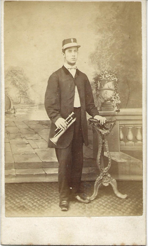 Studio Carte de Visite of a British Army Musician. He wears a musician's coat and a kepie hat. He holds his trumpet. Backmark "Established 15 years. W.H. Fawn, 31 Walworth Road Near the Elephant Station. Faded Portraits Restored and Copied." | SALE $38.00 |