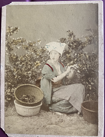Shows a seated Japanese woman picking tea leaves, surrounded by several baskets. Has hand tinting to photograph. Approximately 4-1/5" x 5-1/2" overall. There is damage to two of the corners (see image link). Has "Tea Picker" in faint pencil on back. Evidence that it was once glued in an album, remnants of black paper on back. | SALE $30.00 | |