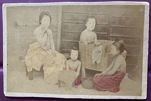Shows a seated Japanese woman with three children, wooden tub and two other pots. Hand tinted. Approximately 3-3/5" x 5-3/5" overall. Evidence that it was once glued in an album, small remnants of black paper on back. | SALE $30.00 | |