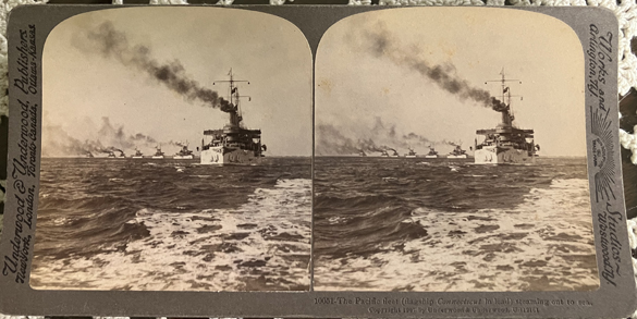 Titled "10051- The Pacific fleet (flagship Commecticut in lead) steaming out to sea. Copyright 1907 by Underwood & Underwood. U-112161" Gray mount.