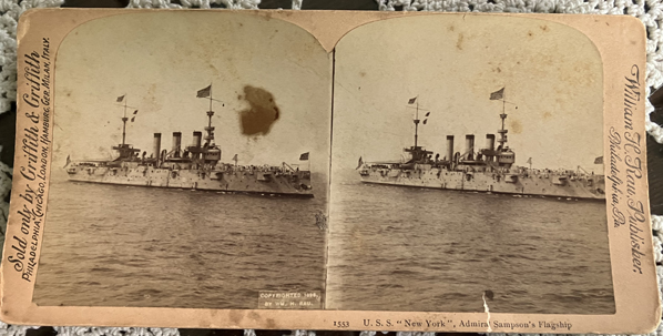 Titled "1533 U.S.S. 'New York', Admiral Sampson's Flagship. Copyrighted 1898 by Wm.H. Rau." Sold only by Grifith & Griffith, Wiliam H. Rau Publisher. Has small tear on lower right hand of card. Buff mount.