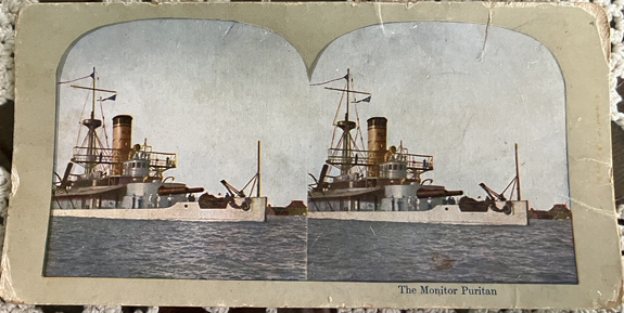 Titled "The Monitor Puritan" . It has a grayish mount. Description of ship on the back with details. Colorized photograph.